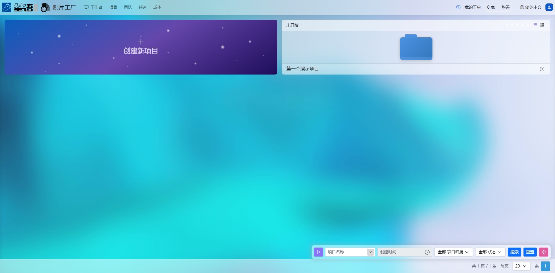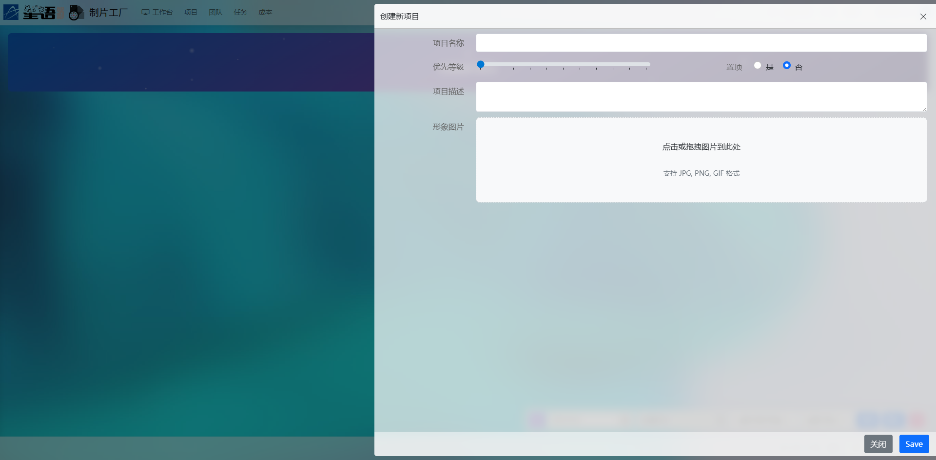 进入制片工厂项目列表页面后,点击顶部导航栏中的“创建新项目”按钮,页面右侧将滑出项目信息填写表单。