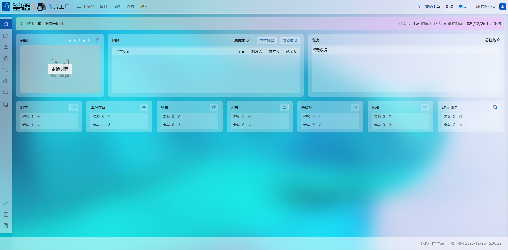 左侧主菜单项依次为:项目首页、剧本、出演阵容、创景、道具、关键帧、片段、图片编辑、团队成员、任务、成本预算。